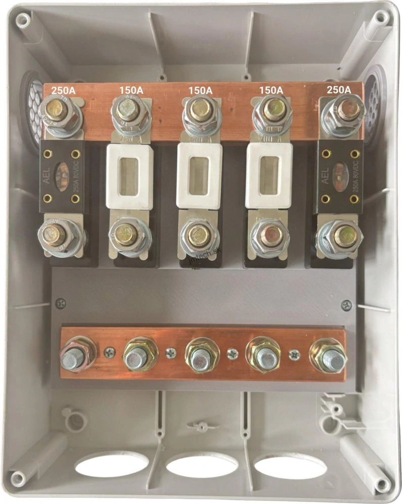 Batériový box slúži pre paralelné prepojenie 3 batérií a 2 meničov v napäťovej hladine 48 V DC. Box je vybavený poistkami 150 A pre jednotlivé batérie a 250 A pre výstup k meniču. Box je dobre pripravený na inštaláciu prívodných aj odchádzajúcich káblov vďaka trojici otvorov na spodnej strane krabice. K boxu je dodávaný odpojovač pre DIY inštaláciu. Štandardná verzia obsahuje medený pás s výškou 5mm, u zosilneného je to 10mm.